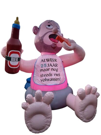 Voor wie is deze tekst heel toepasselijk?! De leeftijd is vrij invulbaar. Naast dat deze pop leuk is voor iemand die 50 jaar wordt, kan deze pop ook zeer leuk zijn als uw kind 25 jaar wordt en zich af en toe nog steeds als een kind gedraagt. Welke jarige is nog jong van geest en kan deze pop wel waarderen? Het is in ieder geval iets heel anders dan de standaard Abraham poppen. Deze opblaasbare baby is 3 meter hoog. Vervoer : Past in iedere auto middels handzame draagtas. Bijgeleverd : Blower (220 volt), spantouwen en grondharingen.