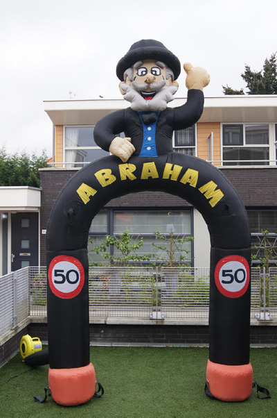 Nieuw in ons assortiment de Abraham cartoon feestboog. Zorg voor een spetterende entree met deze prachtige feestboog. Men komt gelijk in de feest stemming. Waar is dat feestje? Nou over die vraag hoef je je geen zorgen over te maken. De boog is lekker opvallend en niet te missen. Abraham staat met zijn zwarte hoed en grijze baard de visite met een glimlach welkom te heten. Wie wordt hier nou niet vrolijk van! De Feestboog is 3,5 meter hoog en 2,10 meter breed de doorsnede van de feestboog is 0,40 centimeter. De binnen ruimte is 1,30 meter breed en 2 meter hoog. Deze nieuwe blikvanger mag niemand ontgaan waar iedereen zal zien dat er een jarige is. Zoals wij zeggen je loopt door je 50 levensjaar!