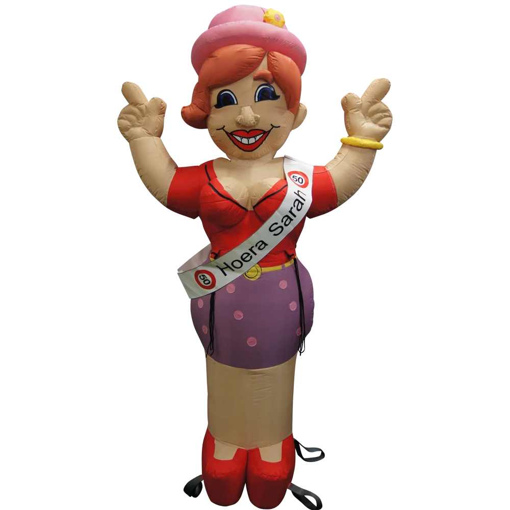 Deze feestende Sarah Cartoon pop is ook ideaal om binnen te zetten!! Met haar rode lippen, top en schoenen trekt ze zeker de aandacht! Wie is ook altijd in voor een feestje? Gooi de handjes in de lucht en maak er een dag van om nooit te vergeten! Deze Sarah pop is snel en eenvoudig op te zetten, deze poppen zijn ook ideaal geschikt om binnen te plaatsen met hun hoogte van 2,7 meter. Deze poppen worden continu van lucht voorzien met een meegeleverde blower. Ook een 50 jarige binnen uw familie? Aarzel niet om ons te benaderen we hebben altijd wel iets in ons assortiment voor u. Wordt de dame in kwestie geen 50 jaar? Ook geen probleem, we kunnen de pop van verschillende leeftijden voorzien. Vervoer : Past in iedere auto middels handzame draagtas. Bijgeleverd : Blower (220 volt), spantouwen en grondharingen.