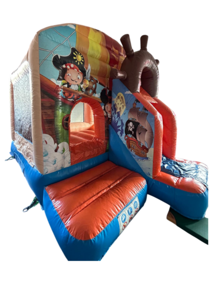 Het Piraat springkussen is een mooi en vrolijk kussen, helemaal in thema van de piraat. Ze voelen zich als Piet Piraat die springt. De “ramen” in de zijkanten zijn voorzien van elastieken netten, licht kan daardoor naar binnen, maar de kinderen kunnen er niet door naar buiten klimmen. De afmetingen van het kussen zijn 4X3 meter. De instap is makkelijk gemaakt middels een schuinslopende verhoging van ca. 50 cm.