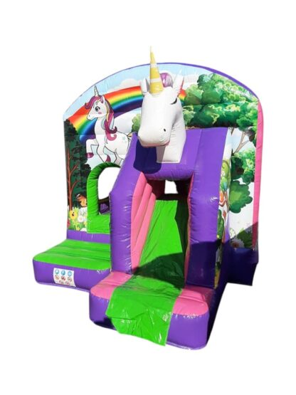 Mini unicorn springkussen met glijbaan overdekt huren