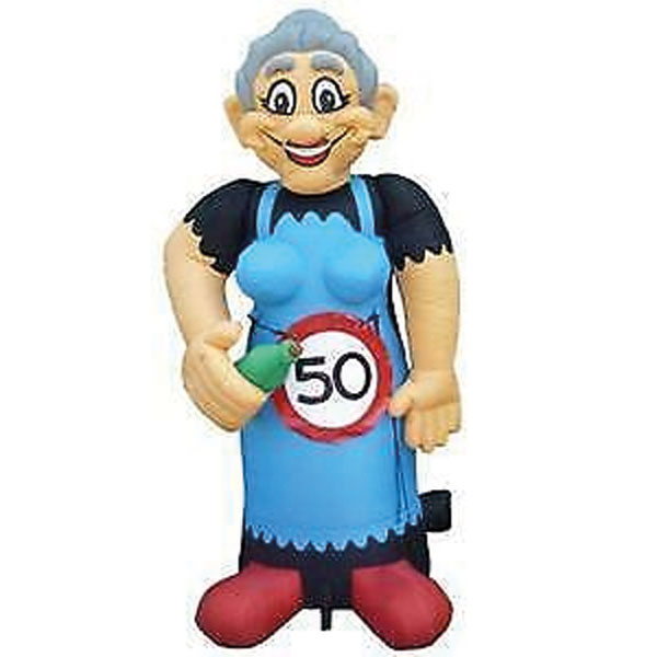 Een blauw schort om, haar in een knot en een borrel in de hand, deze Opblaasbare Sarah pop is er klaar voor om alle gasten te verwelkomen. Met een grote glimlach heet ze iedereen welkom! Dit vraagt haast om een extra schort erbij voor de jarige als cadeau. Kunnen ze samen matchend op de foto, leuk om de 50 jarige zo in het zonnetje te zetten. Deze zal niemand ontgaan. De opblaasbare Sarah cartoon is een zeer leuke en mooie pop, ook kunnen we de pop van een andere leeftijd voorzien. We hebben ook opblaasbare Sarah pop van 4,5 meter. Vervoer: Past in iedere auto middels handzame draagtas. Bijgeleverd : Blower (220 volt), spantouwen en grondharingen.
