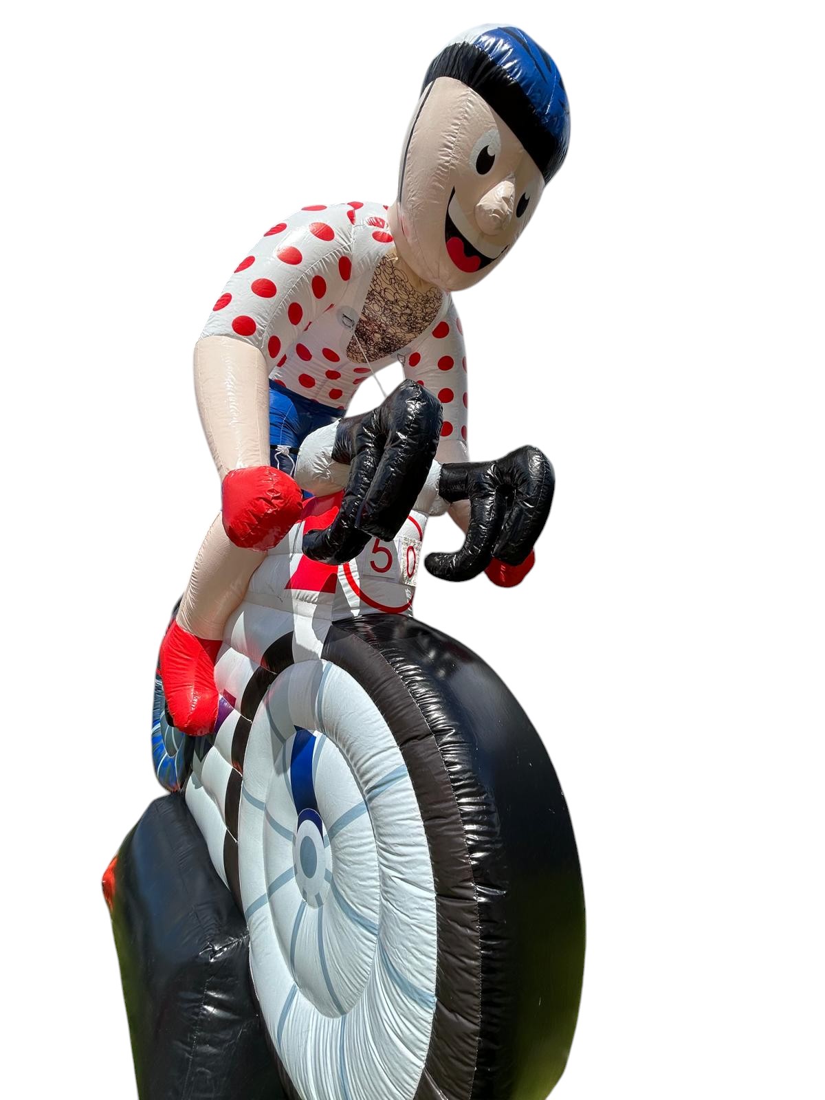 Deze opblaasbare pop huurt u geheel compleet met spantouwen en blower. Geen 50 jaar? Geen probleem, de opblaas wielrenner is ook mogelijk met andere leeftijden. Vraag ons om de mogelijkheden.