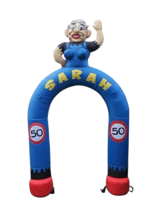 Nieuw in ons assortiment de Sarah cartoon feestboog. Verras de jarige en laat alle gasten onder de boog door het feest betreden om samen het nieuwe levensjaar te vieren. Deze opblaasbare feestboog is 3,5 meter hoog en 2,10 meter breed de doorsnede van de feestboog is 0,40 centimeter. De binnen ruimte is 1,30 meter breed en 2 meter hoog. Deze nieuwe blikvanger mag niemand ontgaan. De hele straat zal zien dat er een jarige is. Zoals wij zeggen je loopt door je 50 levensjaar! Vervoer : Past in iedere auto middels handzame draagtas. Bijgeleverd : Blower (220 volt), spantouwen en grondharingen.