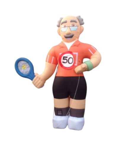 De Tennis Abraham pop is een must voor de sportieve Abraham. Een service, forehand of een smash, het maakt deze Abraham niet uit! Met een racket in zijn hand, is hij nog goed bij zijn verstand! Knal er goed uit met deze Abraham pop. Door de 4 meter is de pop niet te missen en de perfecte versiering. Deze Abraham pop wordt verder compleet geleverd met blower spantouwen en grondharingen. Ook is het mogelijk om de poppen van een andere leeftijd te voorzien. Verder zit de pop compact ingepakt in een handzame draagtas en is in elke auto te vervoeren. Ook worden de blower (220 volt), spantouwen en grondharingen meegeleverd.